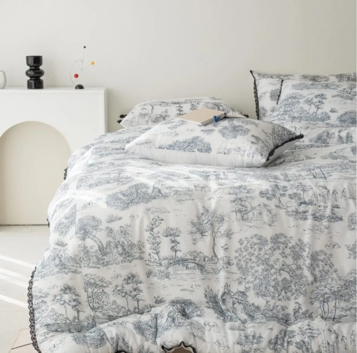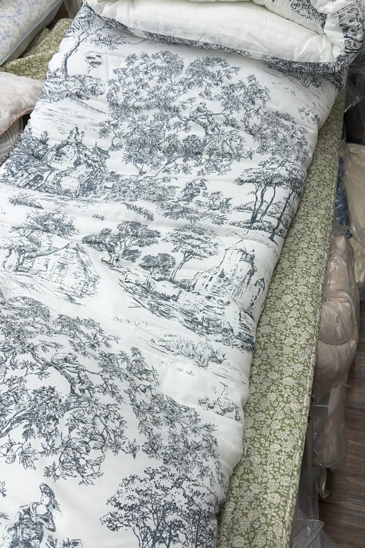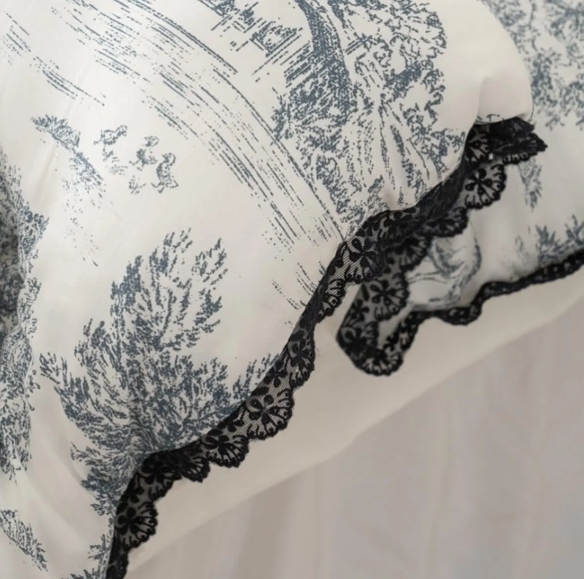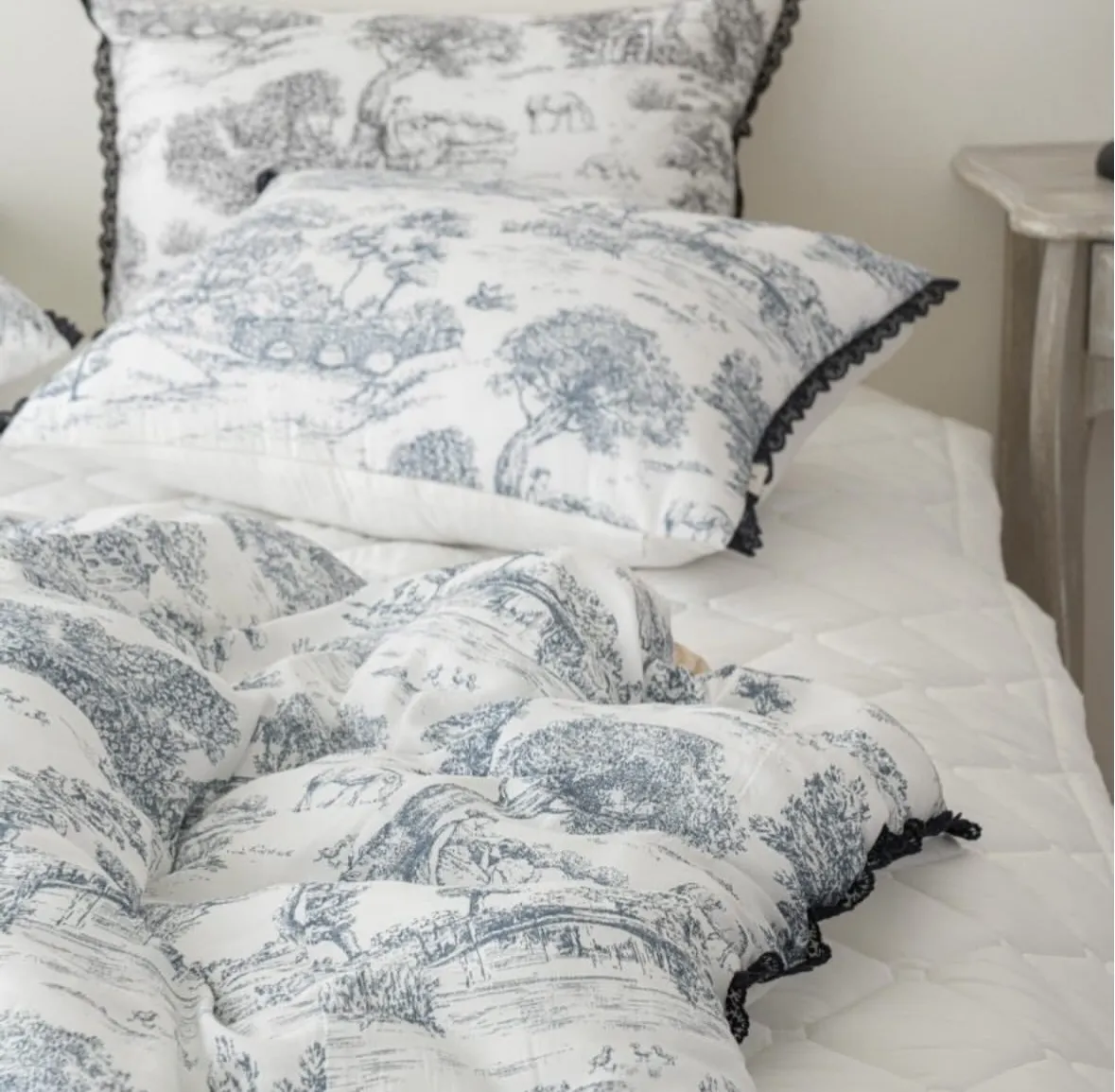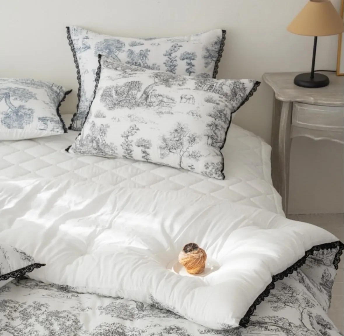 棉被四邊以托蕾蕾絲點綴,展現法式浪漫的經典美學。