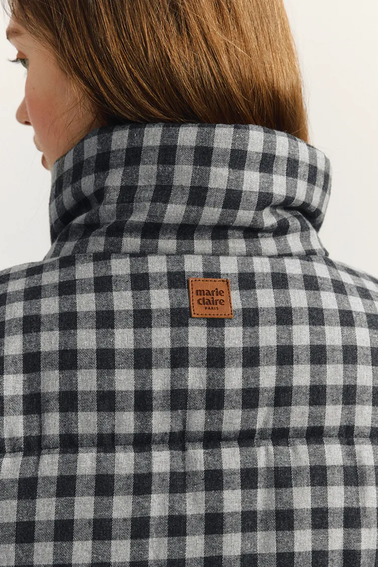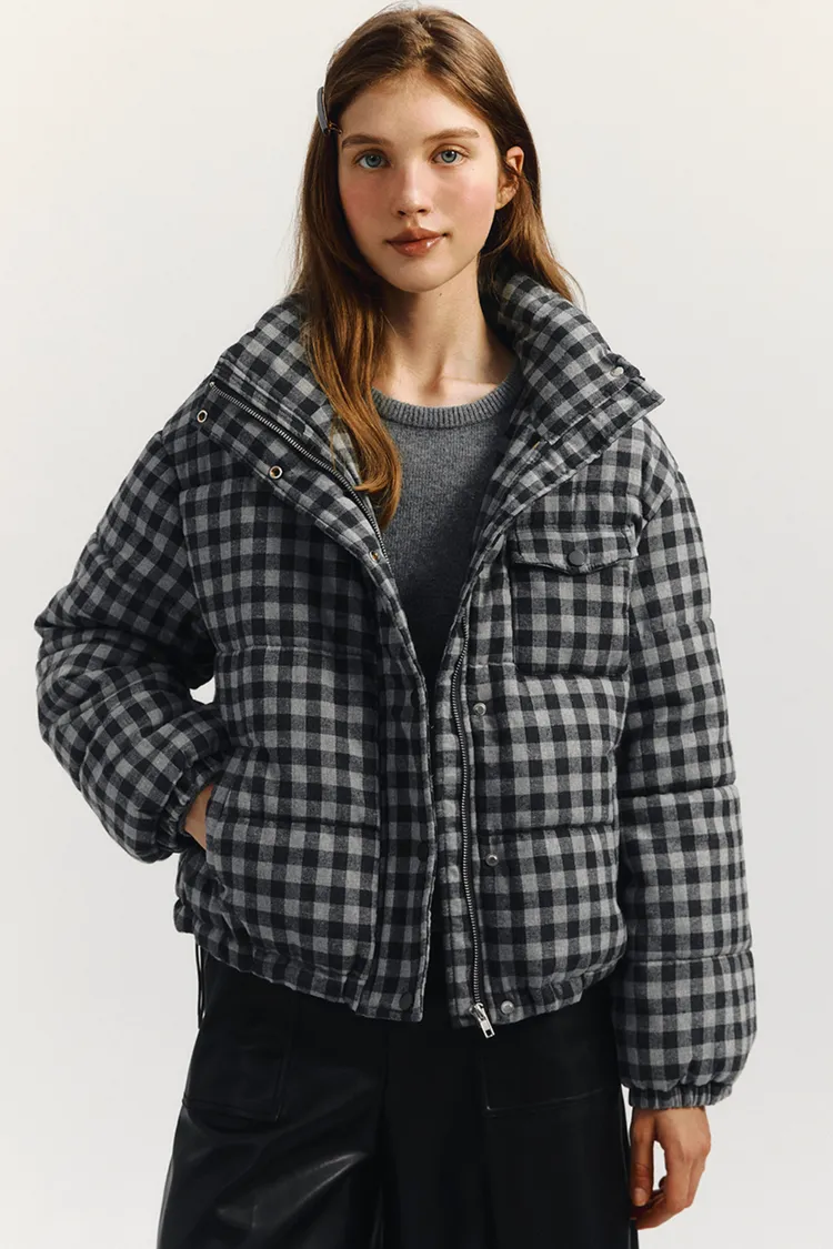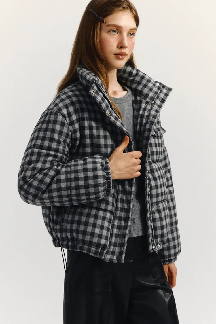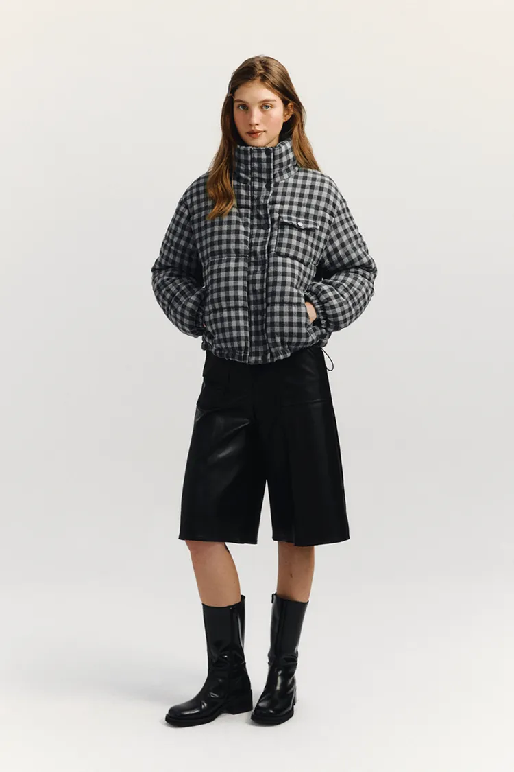 🇰🇷 marie claire 格紋短版鋪棉羽絨外套原價韓幣13萬約台幣3000! 冬季超大折扣中!羽絨外套填充200克棉花,保暖性極佳。抽繩下擺增加保暖性,正面和側邊都有口袋,按扣和隱形拉鍊設計有效防風。純色搭配營造休閒氛圍,Marie Claire皮革標籤具時尚感。顏色:黑白格紋尺寸cm:衣長55肩寬52胸寬57袖長55材質 聚脂纖維69% 棉31%
