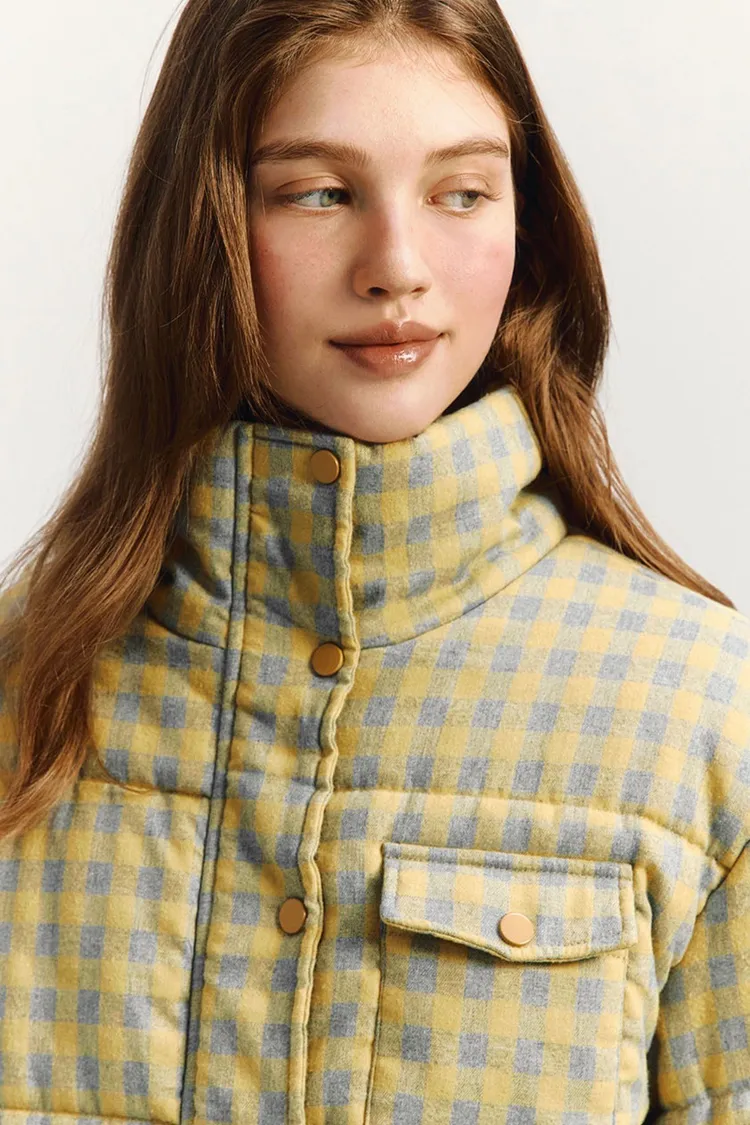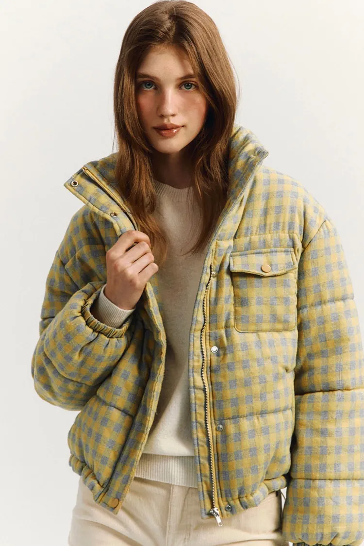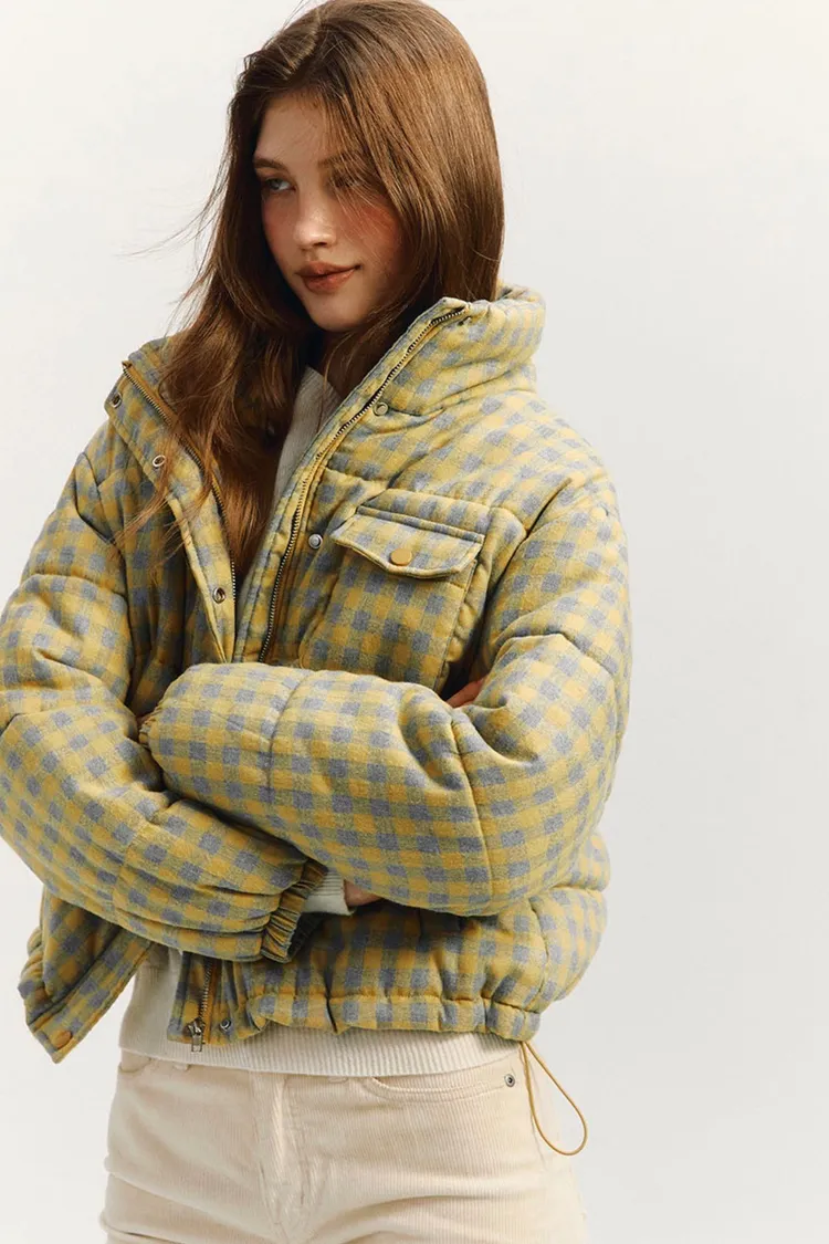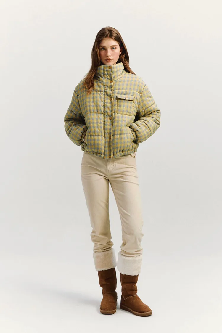 🇰🇷 marie claire 格紋短版鋪棉羽絨外套原價韓幣13萬約台幣3000! 冬季超大折扣中!羽絨外套填充200克棉花,保暖性極佳。抽繩下擺增加保暖性,正面和側邊都有口袋,按扣和隱形拉鍊設計有效防風。純色搭配營造休閒氛圍,Marie Claire皮革標籤具時尚感。顏色:黑白格紋尺寸cm:衣長55肩寬52胸寬57袖長55材質 聚脂纖維69% 棉31%