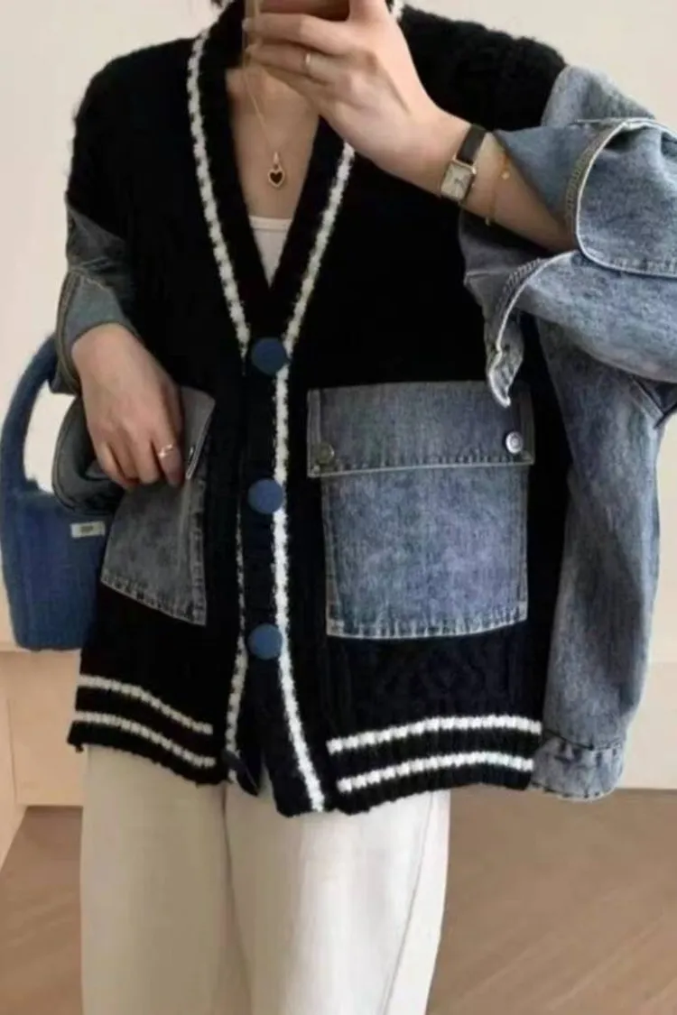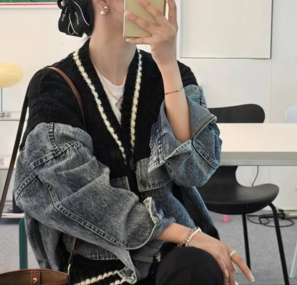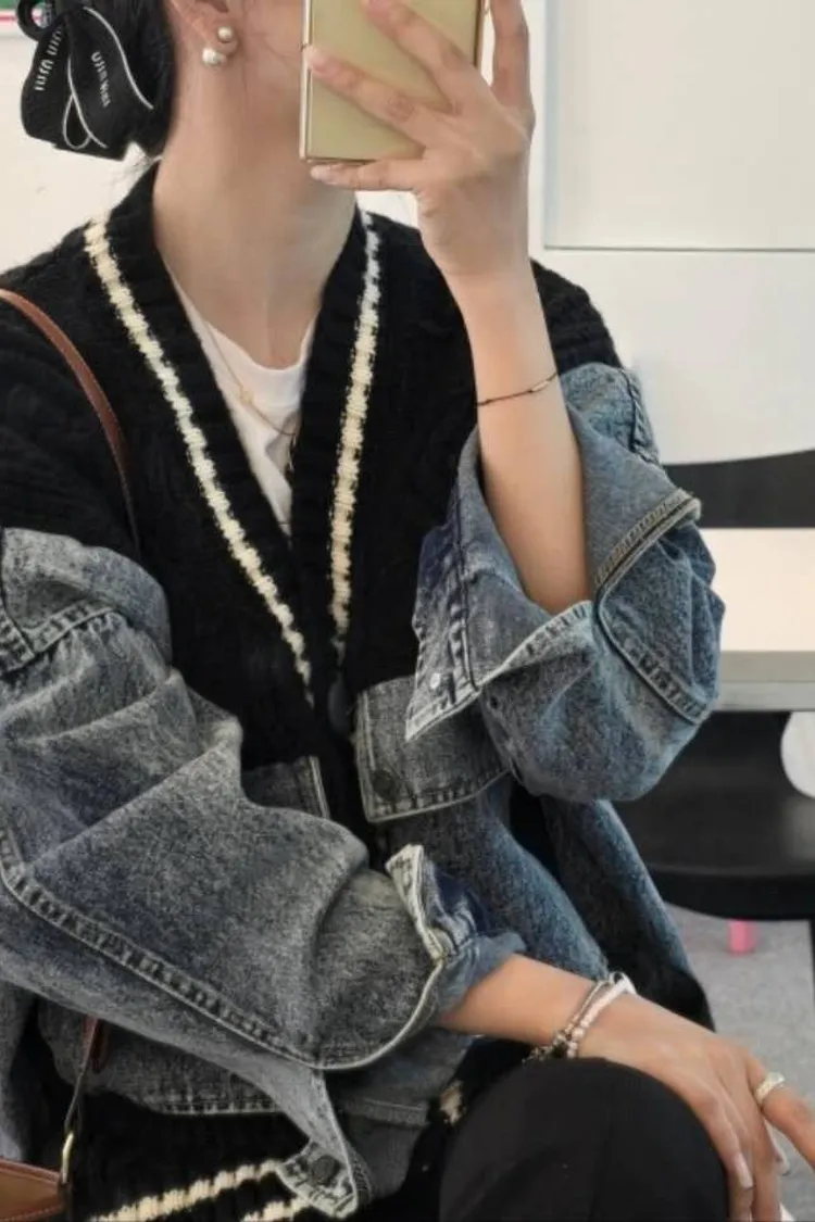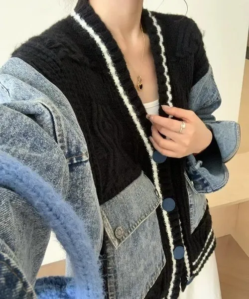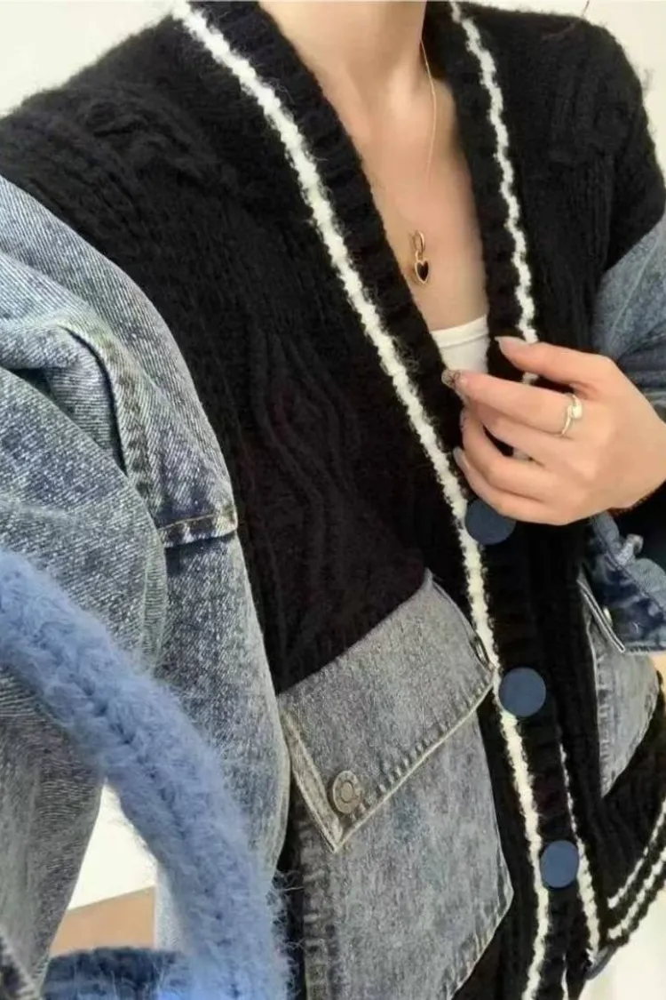 這件外套的特色,在於針織與牛仔的拼接設計。