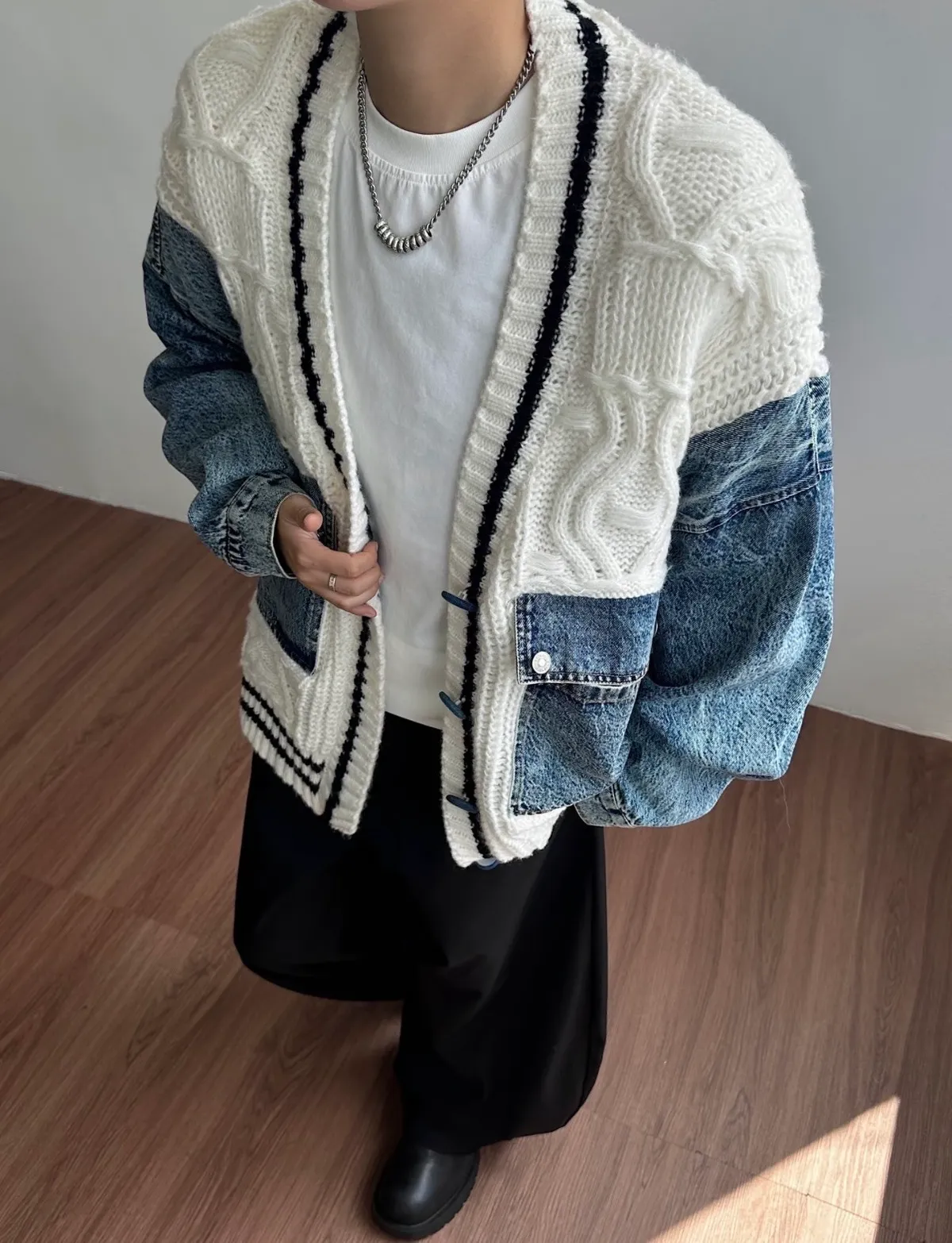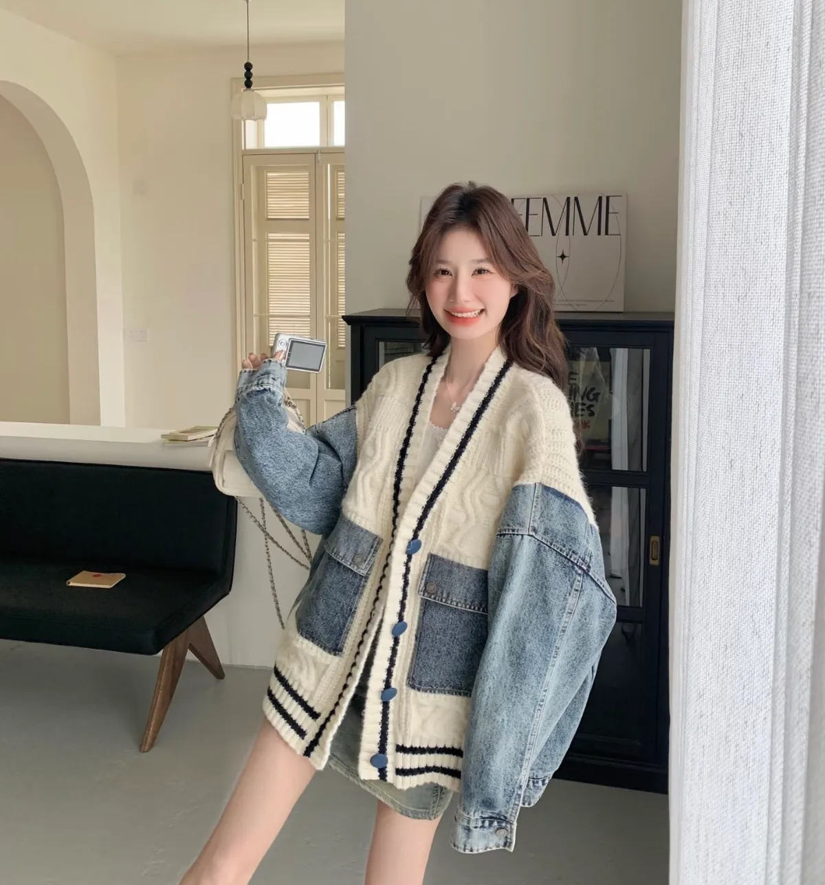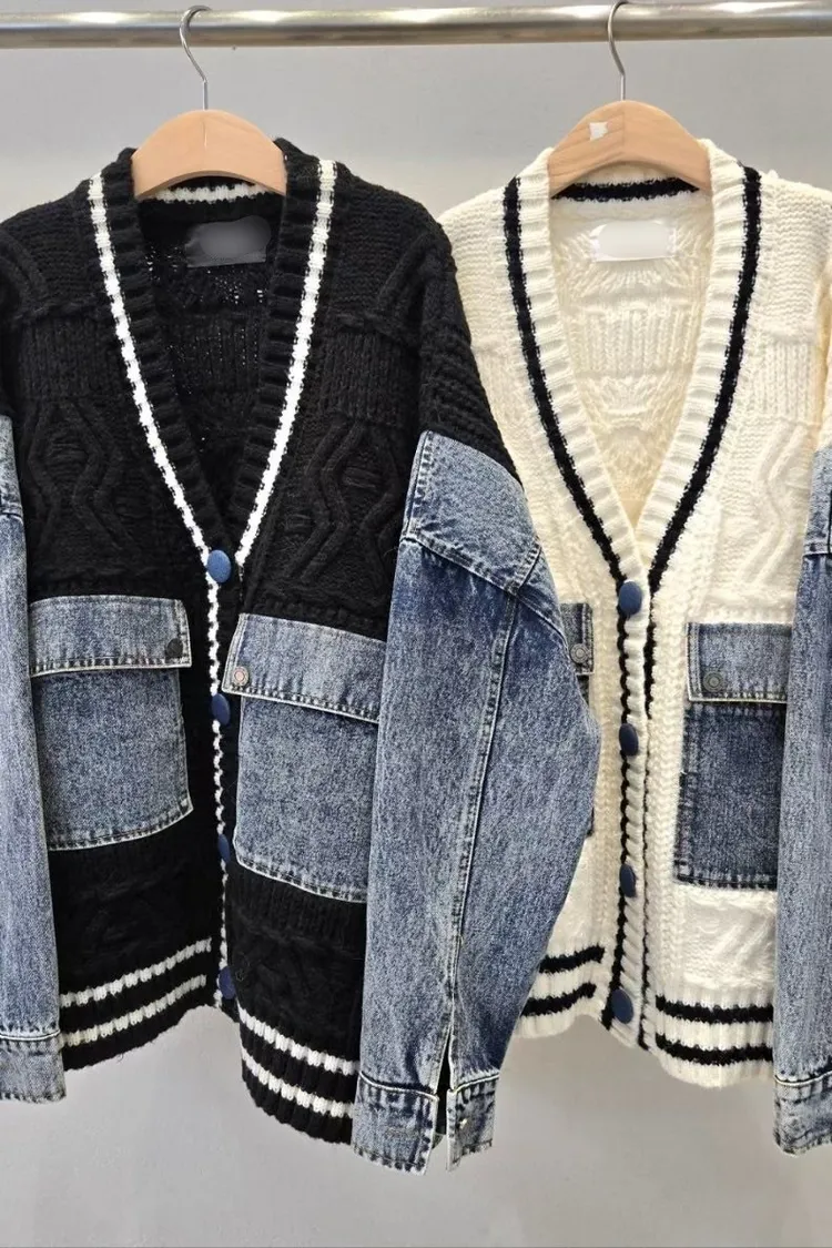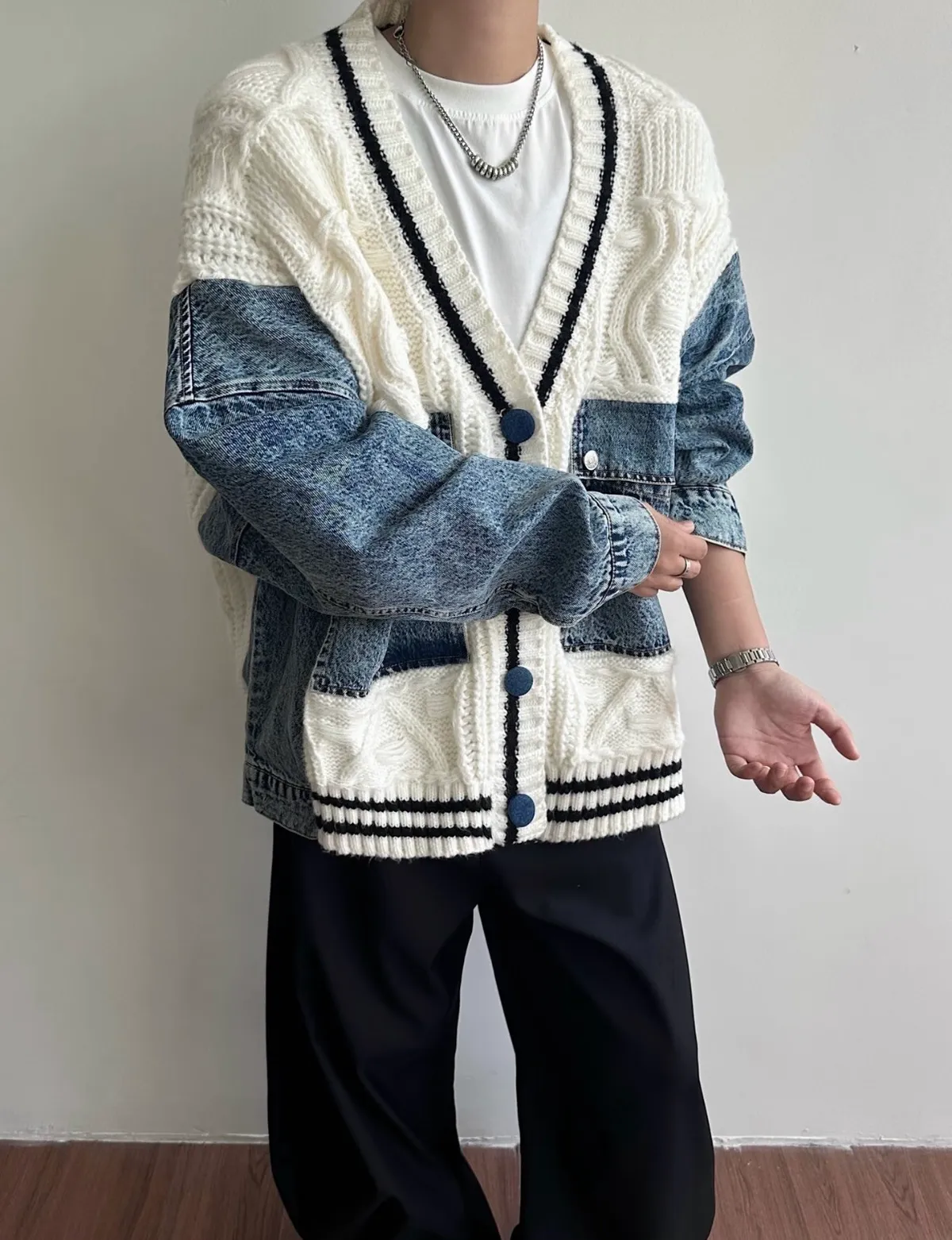 這件外套的特色,在於針織與牛仔的拼接設計。