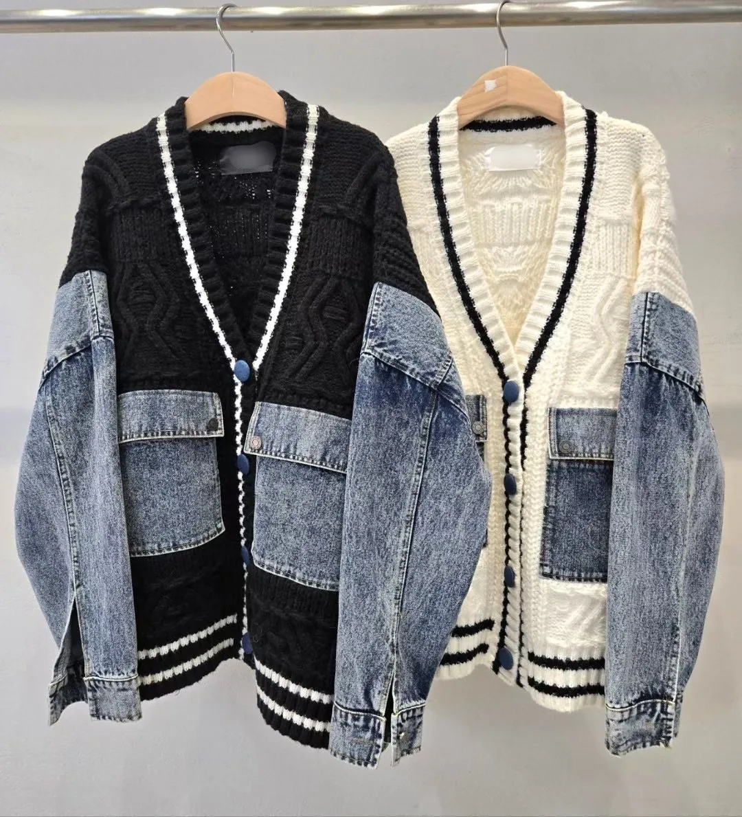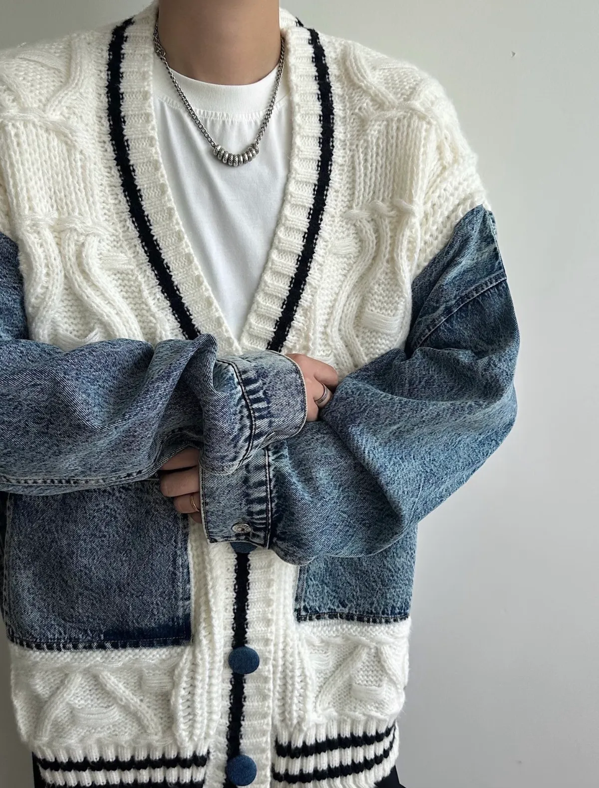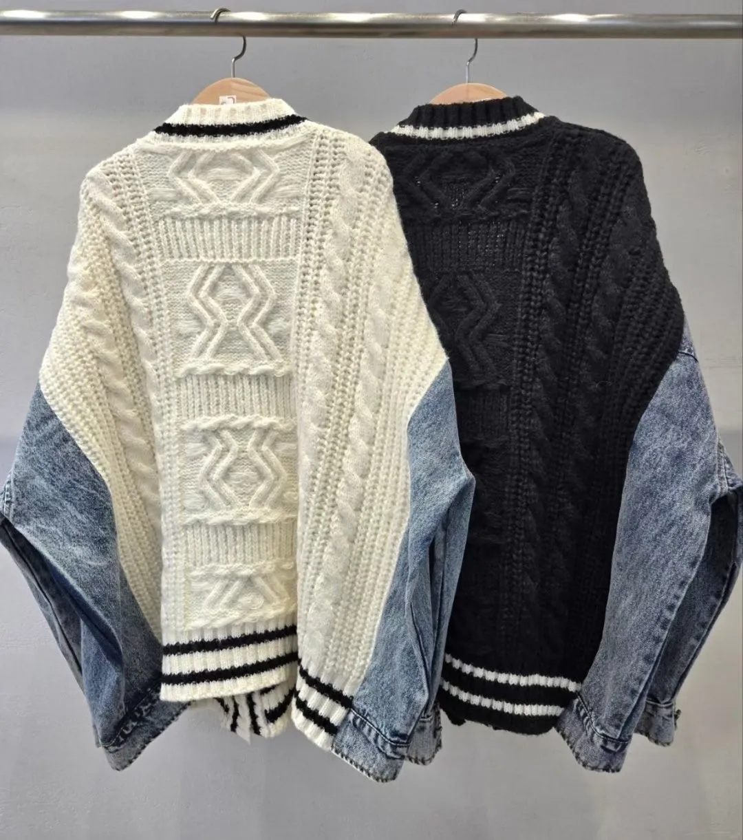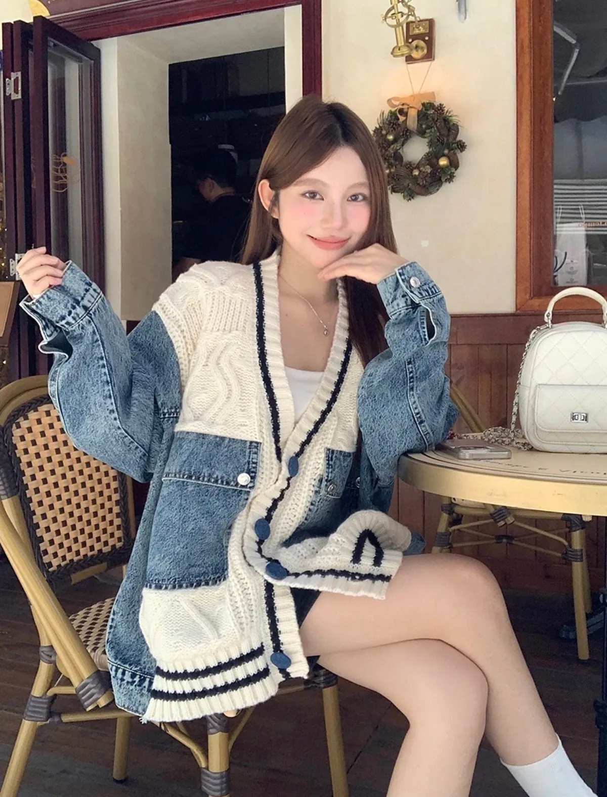 這件外套的特色,在於針織與牛仔的拼接設計。